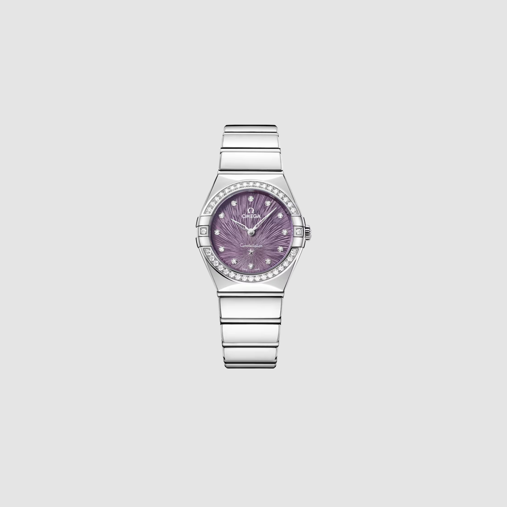Questo modello da 28 mm, realizzato in acciaio inossidabile, è impreziosito da una scintillante lunetta tempestata di diamanti. Il quadrante con trattamento PVD viola, ornato dall’iconico motivo Supernova inciso elettrochimicamente, presenta lancette e stella in oro bianco 18K, e indici delle ore con diamanti incastonati in supporti in oro bianco 18K.