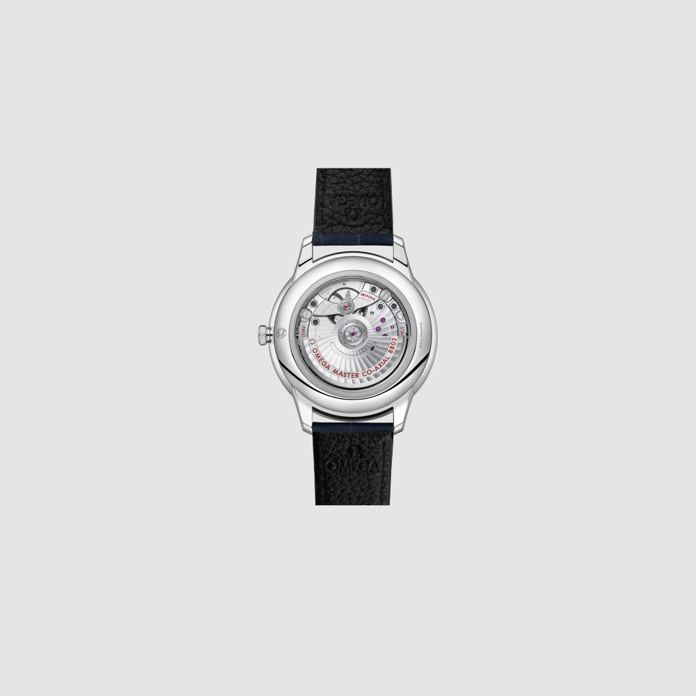 L’orologio certificato Master Chronometer è corredato da un cinturino in pelle blu scuro e animato dal Calibro 8802 OMEGA Co-Axial Master, visibile attraverso il fondello in vetro zaffiro resistente ai graffi.