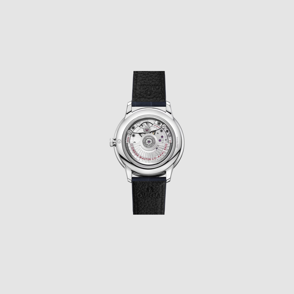 L’orologio certificato Master Chronometer è corredato da un cinturino in pelle blu scuro e animato dal Calibro 8800 OMEGA Co-Axial Master, visibile attraverso il fondello in vetro zaffiro resistente ai graffi.
