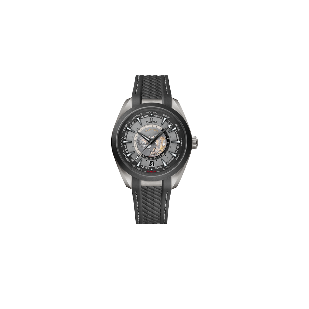 Al centro del quadrante grigio e nero, incorniciato da una lunetta in ceramica nera spazzolata, OMEGA ha riprodotto una rappresentazione della Terra osservata dal Polo Nord, con i continenti colorati ottenuti mediante ablazione al laser su placca in titanio grado 5. A incorniciare la carta topografica, un’indicazione delle 24 ore, suddivisa in sezioni giorno e notte.
