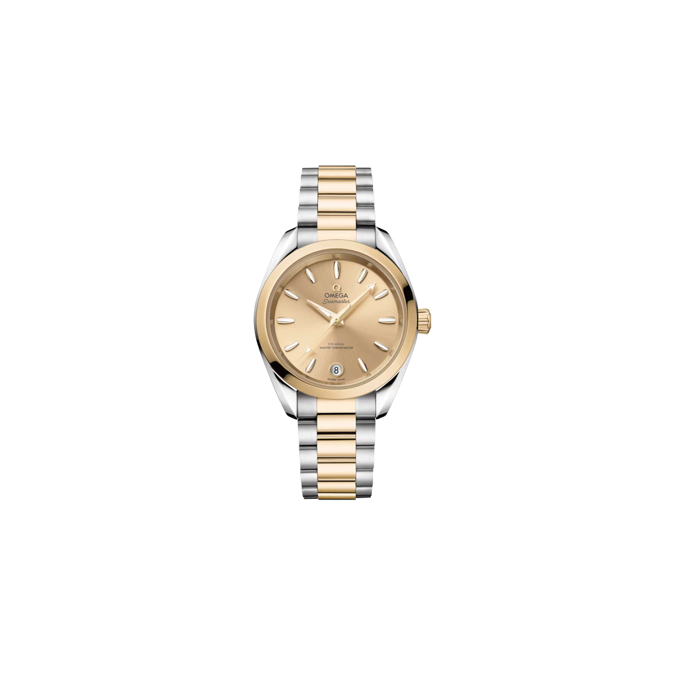 Questo modello da 34 mm in acciaio inossidabile e oro Moonshine™ 18K lucido presenta una corona conica e un fondello piatto in vetro zaffiro con bordo ondulato. Il quadrante spazzolato a raggi di sole, laccato e sottoposto a trattamento in PVD oro Moonshine™ presenta un datario a finestrella circolare a ore 6 incorniciato in oro Moonshine™ 18K. OMEGA ha scelto l’oro Moonshine™ 18K anche per le lancette sfaccettate e gli indici delle ore, dalla forma distintiva ispirata allo scafo di una barca a vela e riempiti di Super-LumiNova bianca.