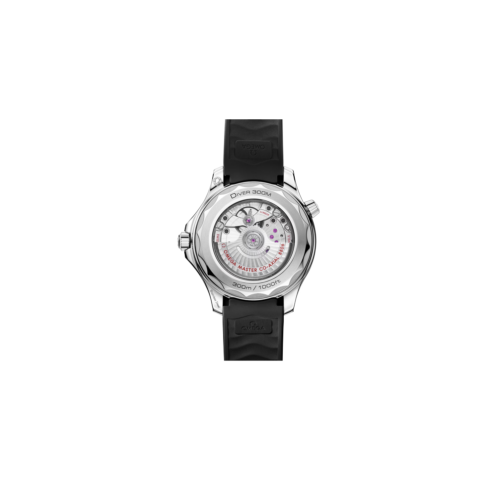 Corredato da un cinturino integrato in caucciù nero con fibbia déployante, l’orologio è animato dal calibro OMEGA Co-Axial Master Chronometer 8806, visibile attraverso il fondello in vetro zaffiro.