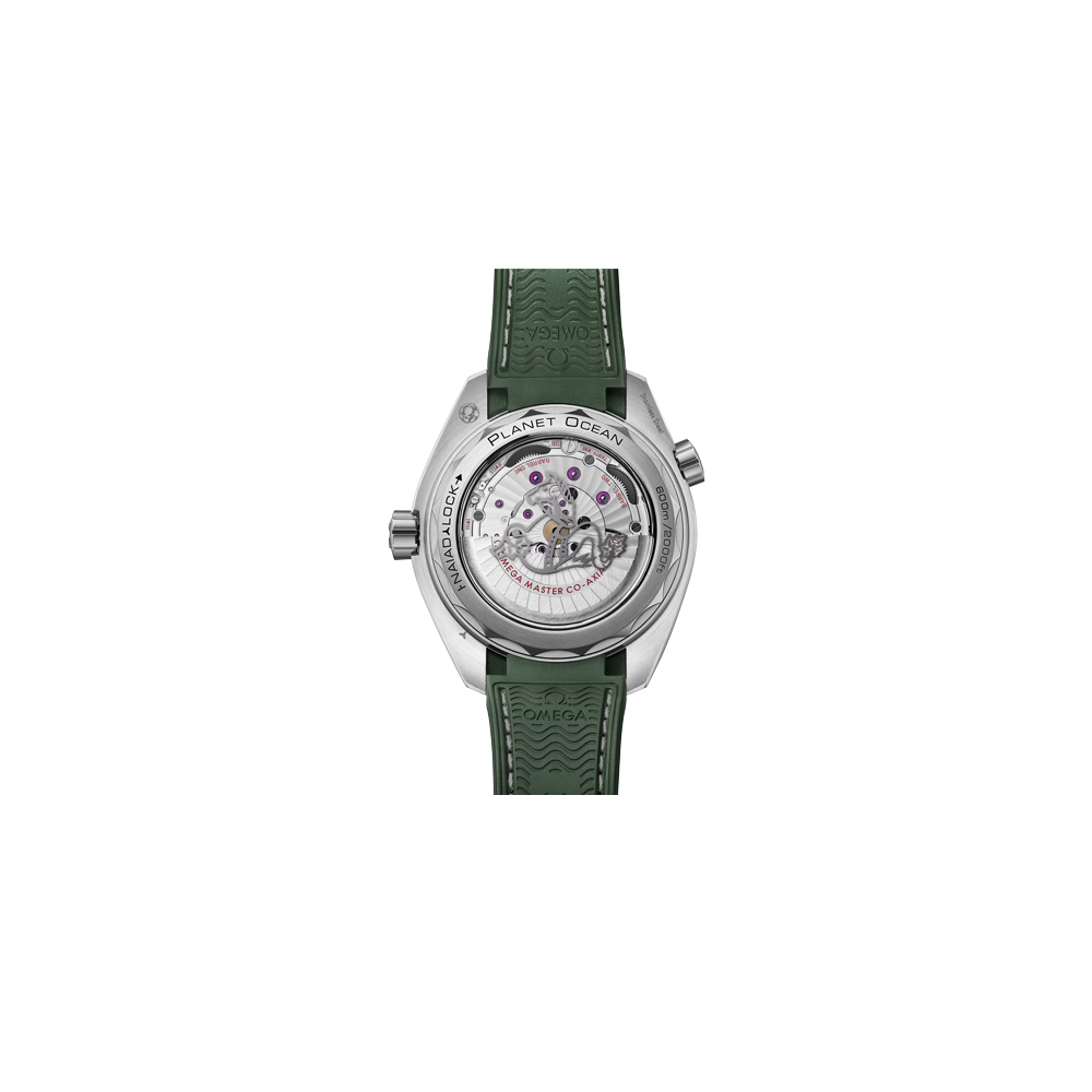 Animato dal calibro Co-Axial Master Chronometer 8900, questo Seamaster Planet Ocean è dotato di cinturino in caucciù verde integrato con motivo strutturato e impunture grigio chiaro e verde. Il fondello con sistema NAIAD LOCK è completato da un cavalluccio marino metallizzato sul vetro zaffiro.