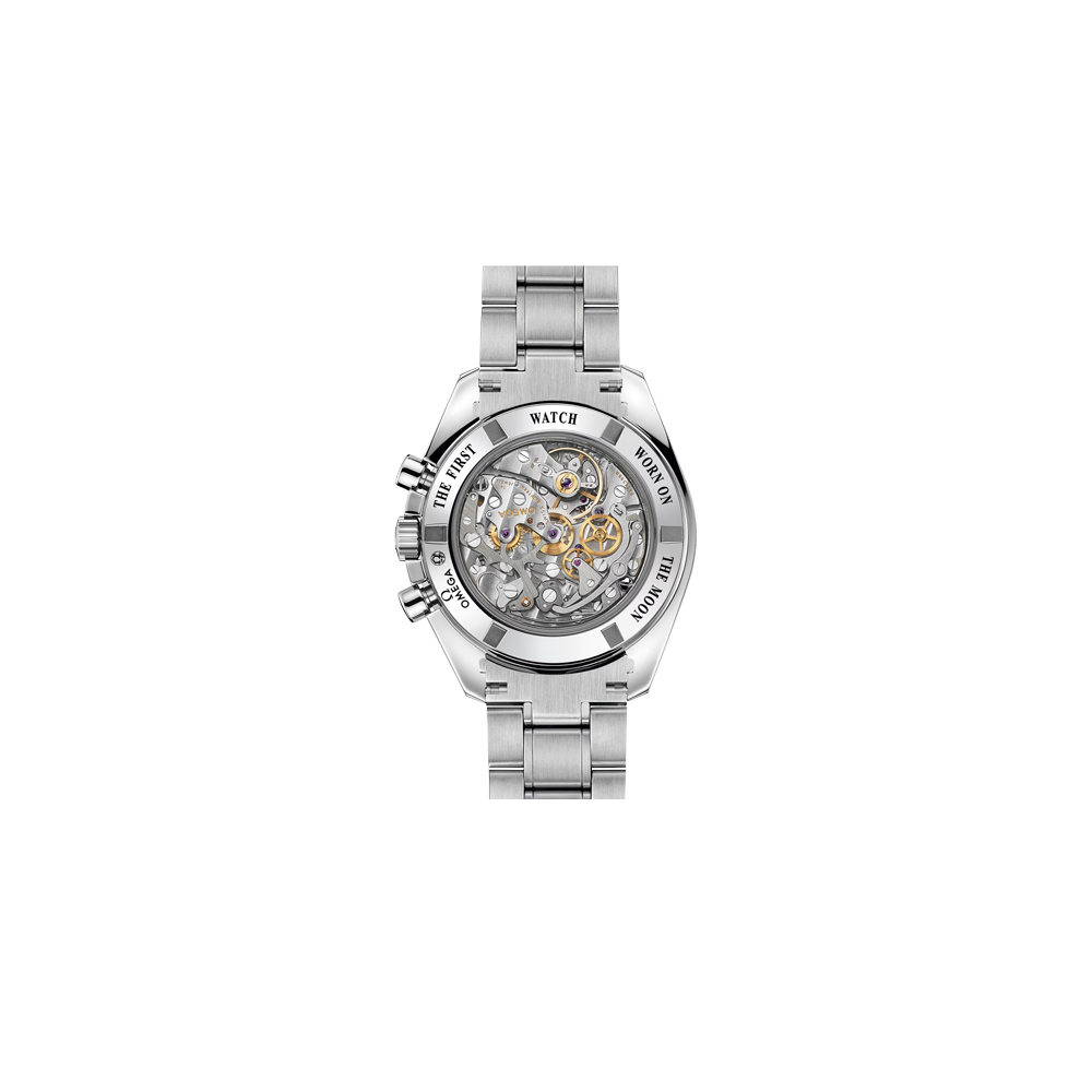 Il cronografo è animato dal calibro meccanico OMEGA 1863, discendente del leggendario movimento manuale indossato sulla Luna, visibile attraverso il fondello trasparente. Questo segnatempo è proposto in una speciale confezione Moonwatch con cinturino “NATO”, un cinturino per astronauti, un apposito strumento per sostituirlo e un libro che racconta le avventure dello Speedmaster.