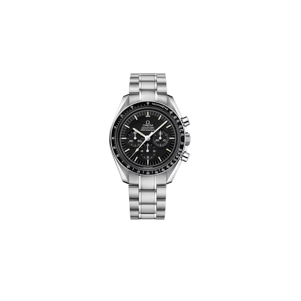 Questo Speedmaster Professional “Moonwatch” di OMEGA presenta un quadrante nero protetto da un vetro zaffiro resistente ai graffi, dotato di quadrantino dei piccoli secondi, contatori 30 minuti e 12 ore e lancetta cronografica centrale. La lunetta nera, con scala tachimetrica, è montata su una cassa in acciaio inossidabile di 42 mm, corredata da un bracciale dello stesso materiale.